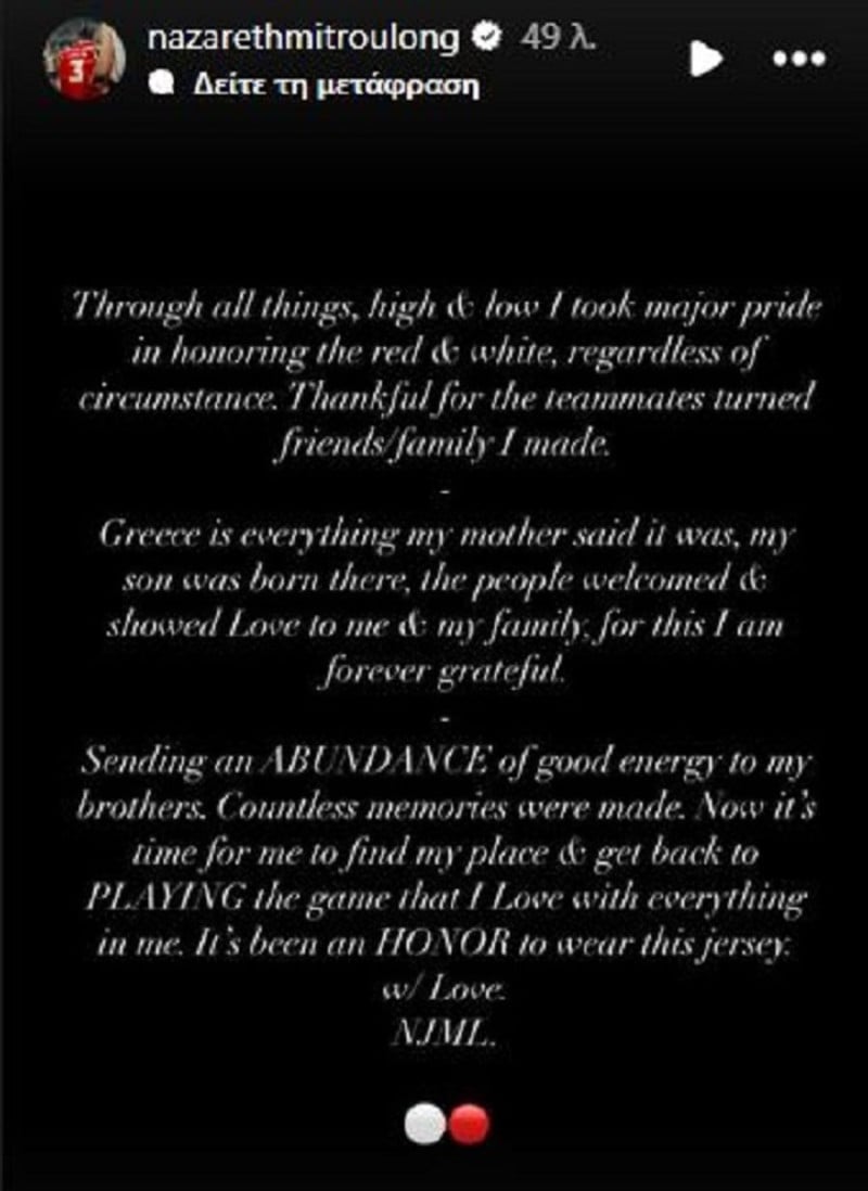 Η Ελλάδα είναι όλα όσα έλεγε η μητέρα μου ότι ήταν, ο γιος μου γεννήθηκε εκεί, οι άνθρωποι υποδέχθηκαν και έδειξαν αγάπη σε μένα και την οικογένειά μου, γι’ αυτό είμαι πάντα ευγνώμων. Στέλνω άφθονη καλή ενέργεια στα αδέρφια μου. Αμέτρητες αναμνήσεις δημιουργήθηκαν. Τώρα είναι η ώρα να βρω τη θέση μου και να επιστρέψω στο να παίζω το παιχνίδι που αγαπώ με όλα όσα έχω μέσα μου. Ήταν τιμή να φοράω αυτή τη φανέλα. Με αγάπη, Ναζ Μήτρου-Λονγκ».