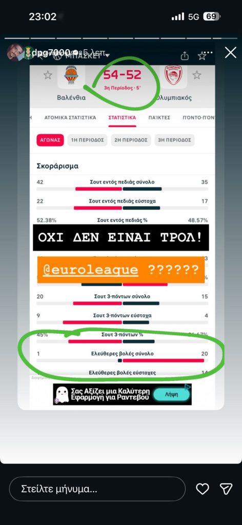 Παράλληλα, o διοικητικός ηγέτης της «πράσινης» ΚΑΕ δημοσίευσε τις βολές του Ολυμπιακού κατά τη διάρκεια του αγώνα με τη Βαλένθια. Οι Πειραιώτες είχαν 20 βολές, αντί για μία της Βαλένθια στα μισά της τρίτης περιόδου, εξηγώντας: «Όχι, δεν είναι τρολ»!