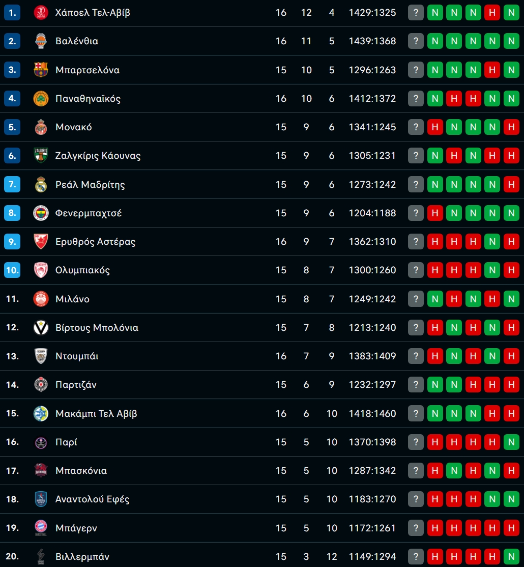 Στο 8-7 έπεσε ο Ολυμπιακός μετά από την 16η αγωνιστική της EuroLeague και την εντός έδρας ήττα από την Βαλένθια (92-99).