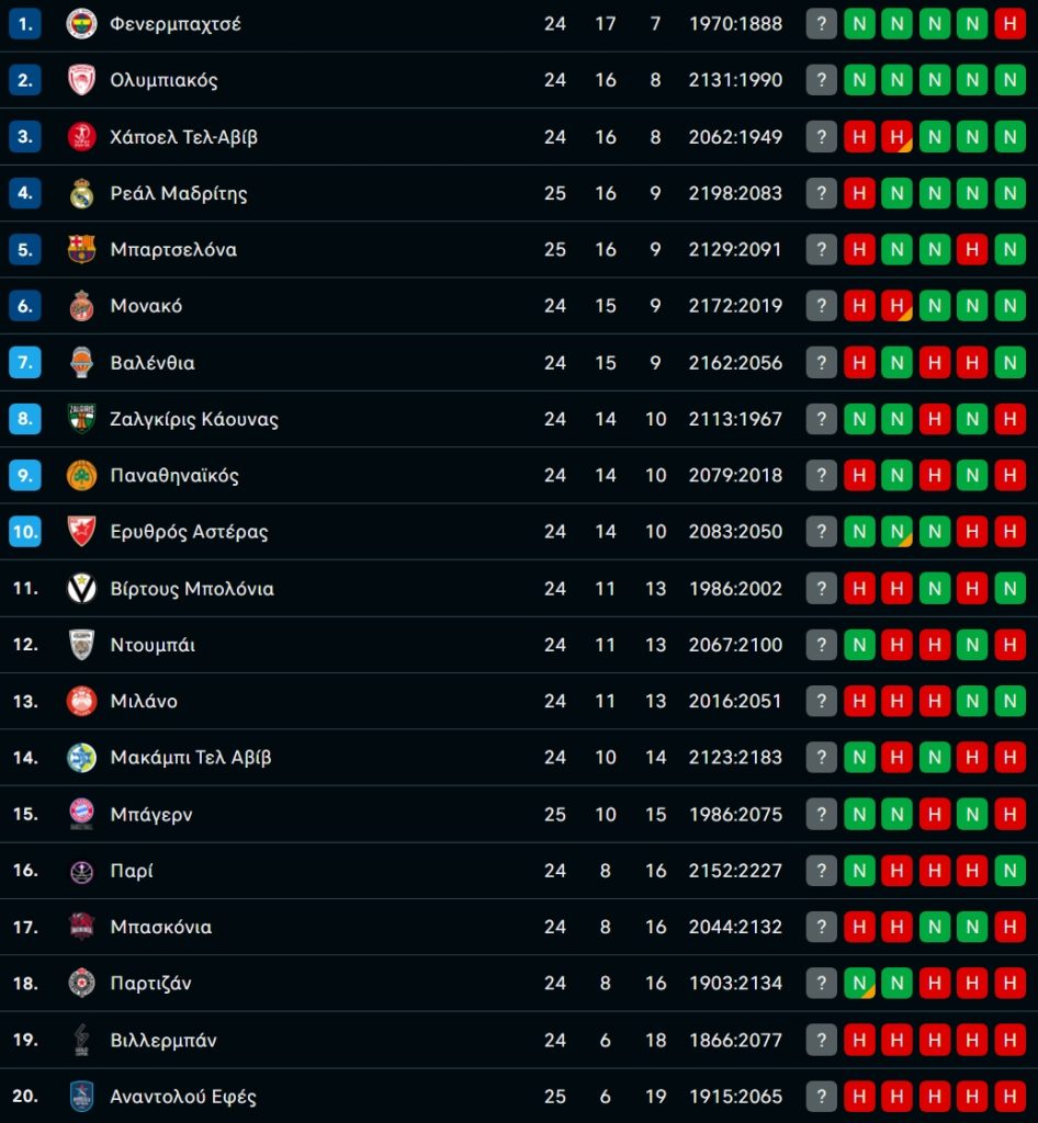 Η βαθμολογία της EuroLeague μετά από την νίκη του Ολυμπιακού επί της Μπαρτσελόνα!