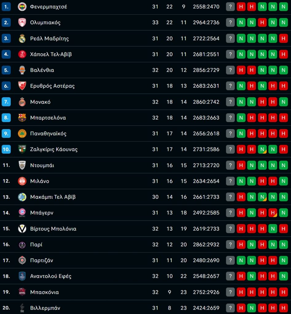 Η βαθμολογία της EuroLeague μετά από την νίκη του Ολυμπιακού επί της Μπασκόνια με 90-80
