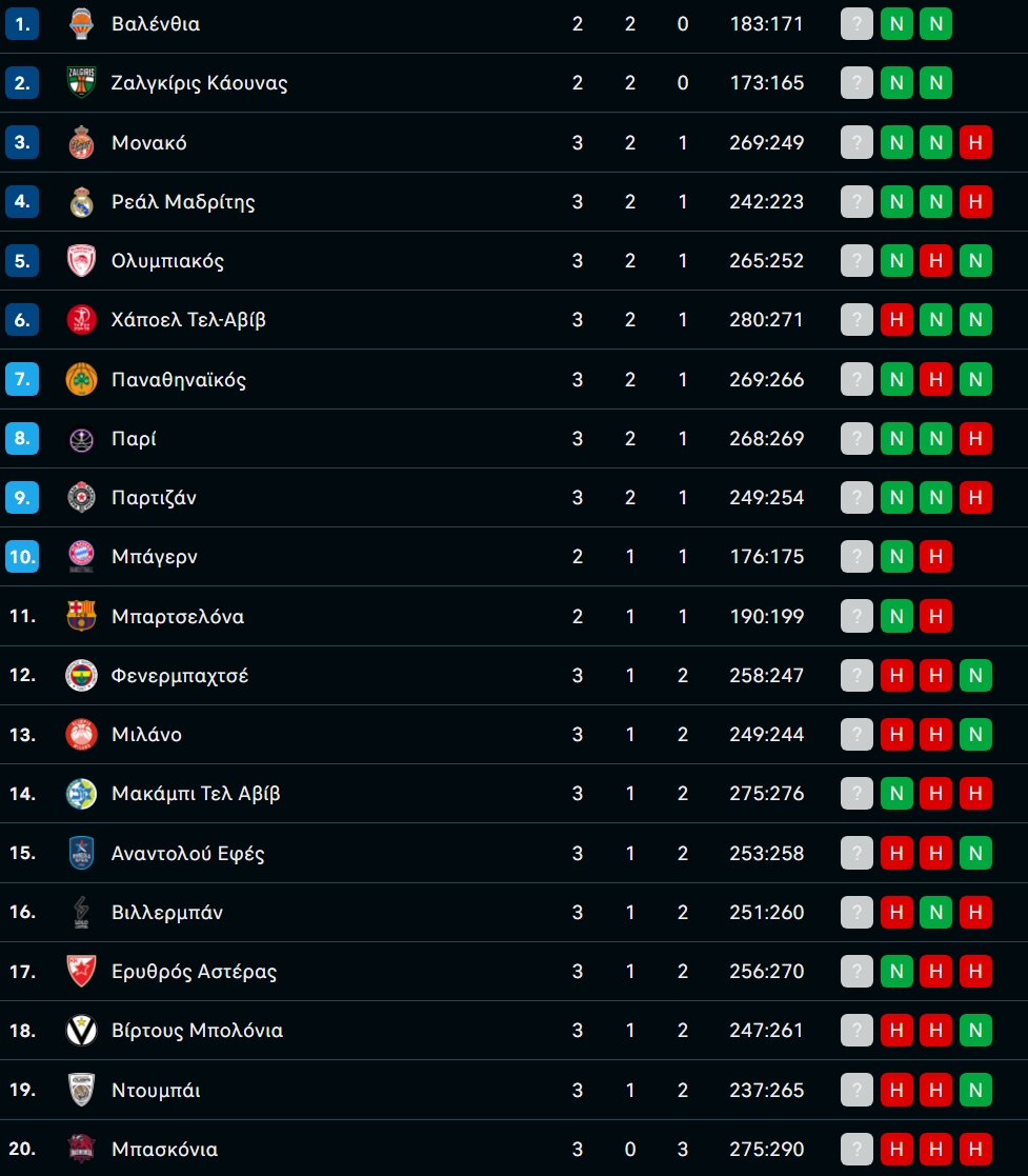 Η βαθμολογία της EuroLeague μετά από την νίκη του Ολυμπιακού επί της Dubai