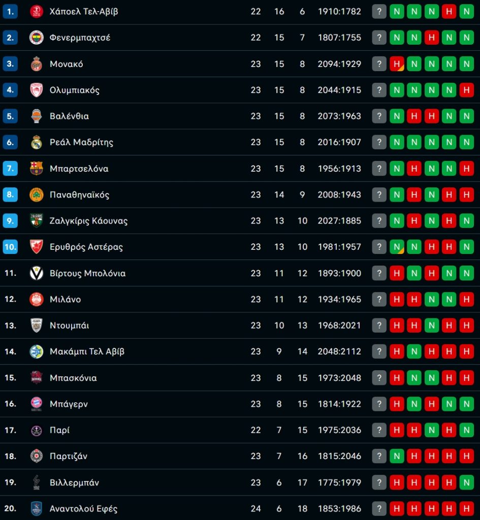 Η βαθμολογία της EuroLeague μετά από την νίκη του Ολυμπιακού επί της Εφές!