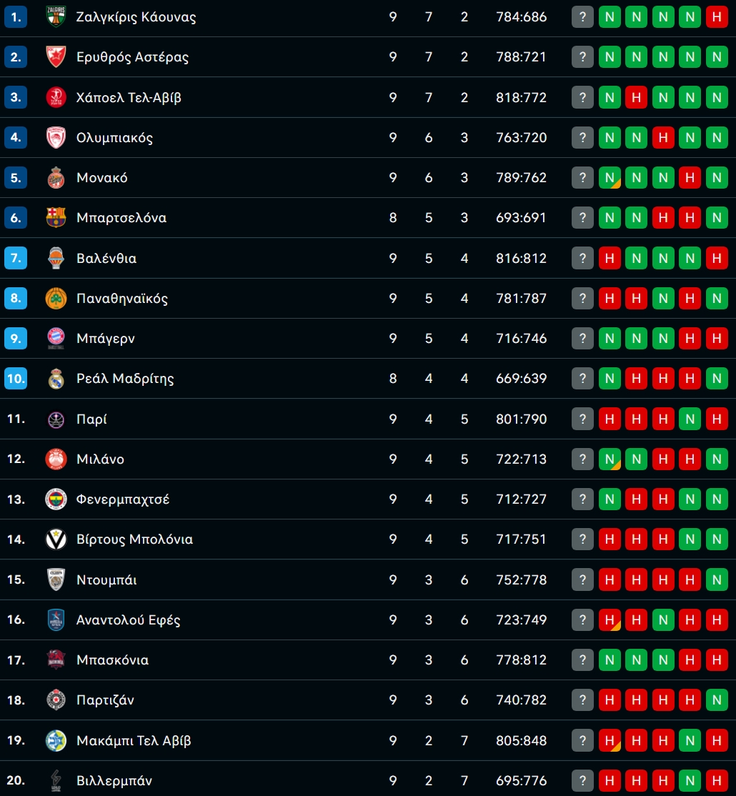 Η βαθμολογία της EuroLeague μετά από την νίκη του Ολυμπιακού επί της Παρτιζάν με 80-71