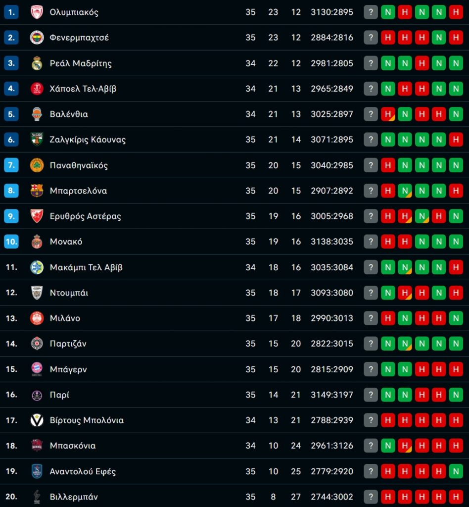 Η βαθμολογία της EuroLeague μετά από την νίκη του Ολυμπιακού επί της Βιλερμπάν!
