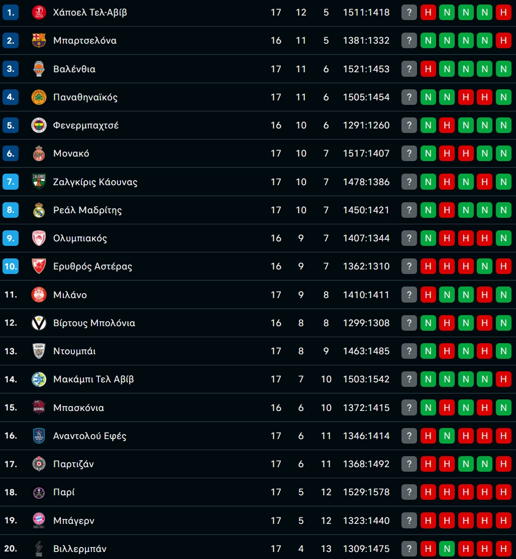Η βαθμολογία της EuroLeague μετά από την νίκη του Ολυμπιακού επί της Βιλερμπάν με 107-84