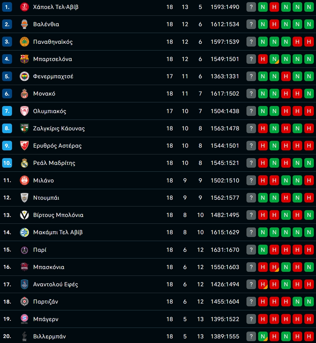 Η βαθμολογία της EuroLeague μετά από την νίκη του Ολυμπιακού επί της Βίρτους με 94-97