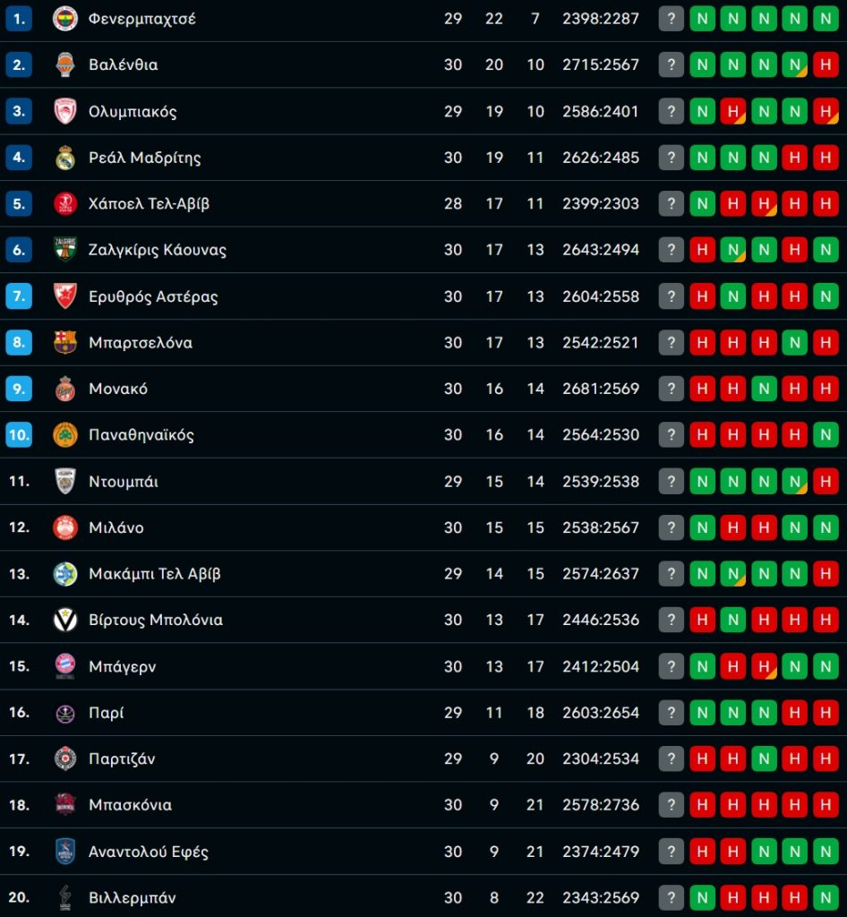 Η βαθμολογία της EuroLeague μετά από την νίκη του Ολυμπιακού επί του Παναθηναϊκού!