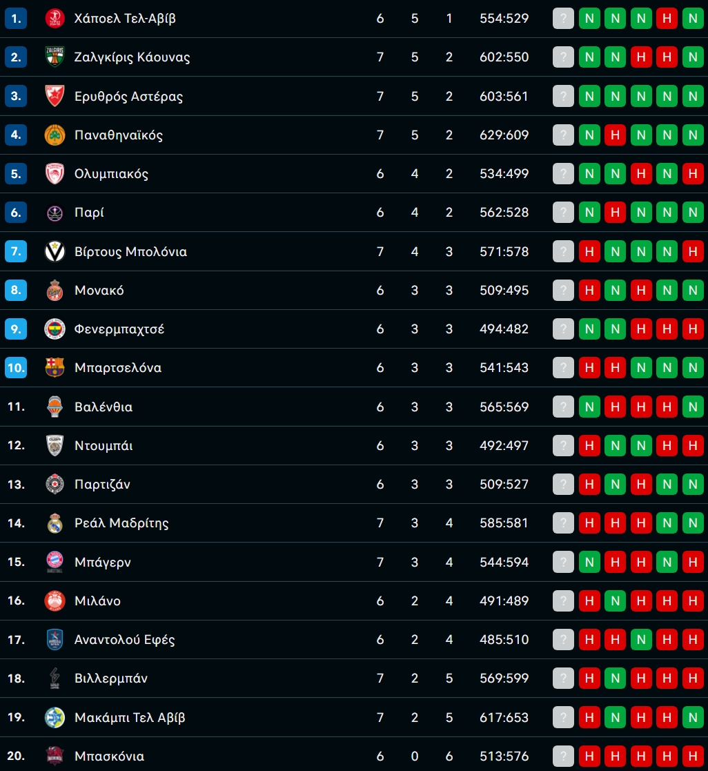 Η βαθμολογία της EuroLeague μετά από την νίκη του Παναθηναϊκού επί της Μακάμπι με 99-85!