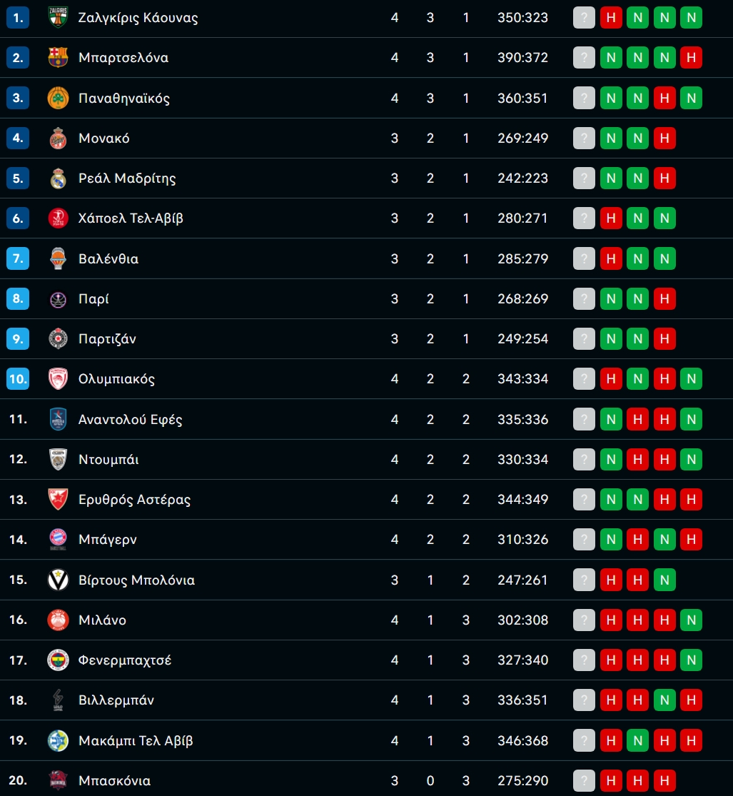 Η βαθμολογία της EuroLeague μετά από την νίκη του Παναθηναϊκού επί της Βιλερμπάν!
