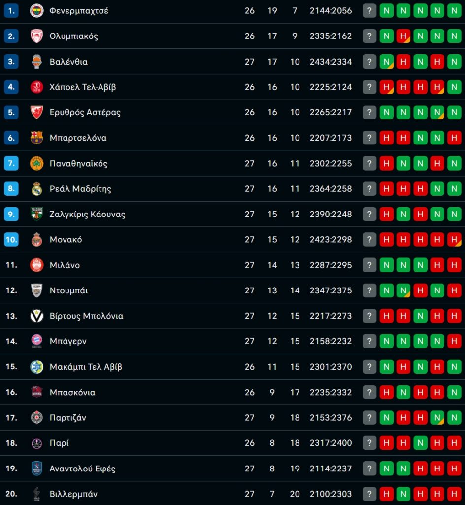Η βαθμολογία της EuroLeague μετά την νίκη του Ολυμπιακού επί της Βίρτους Μπολόνια 109-77!
