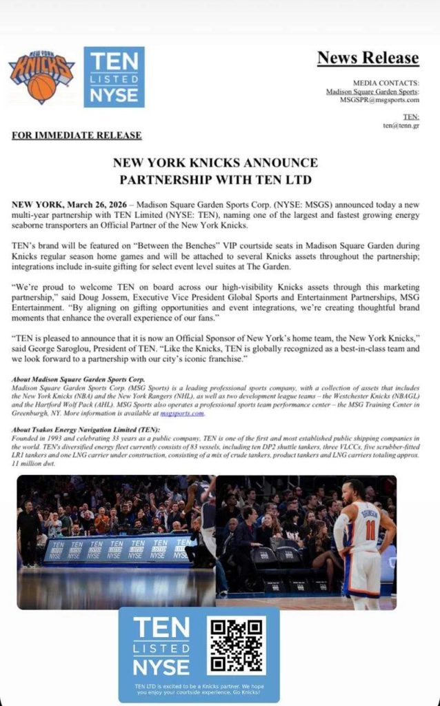 Σε μία κίνηση υψηλού συμβολισμού αλλά και ουσίας για τη διεθνή προβολή της ελληνικής ναυτιλίας, η Tsakos Energy Navigation (NYSE: TEN) ανακοίνωσε τη σύναψη πολυετούς συνεργασίας με την Madison Square Garden Sports Corp. (NYSE: MSGS), καθιστώντας την επίσημο συνεργάτη των New York Knicks.