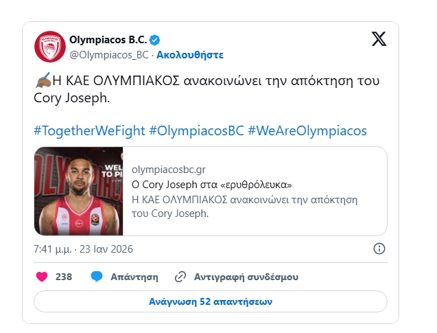 Ο Ολυμπιακός, προχώρησε σε μια μεγάλη κίνηση η οποία ήρθε… από το πουθενά! Οι «ερυθρόλευκοι», ανακοίνωσαν την απόκτηση του Κόρι Τζόζεφ για τον επόμενο ενάμιση χρόνο!