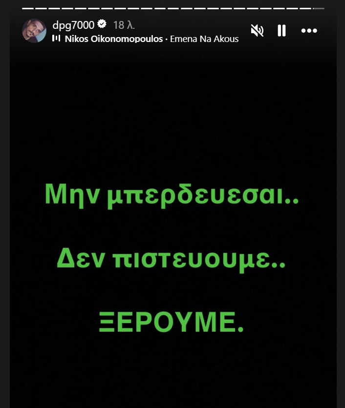 O διοικητικός ηγέτης της πράσινης ΚΑΕ, Δημήτρης Γιαννακόπουλος απάντησε στον προπονητή του Ολυμπιακού μέσω story. ««Μην μπερδεύεσαι. Δεν πιστεύουμε. Ξέρουμε!», έγραψε και τη συνόδευσε με το τραγούδι του Νίκου Οικονομόπουλου με τίτλο «Εμένα να ακούς».