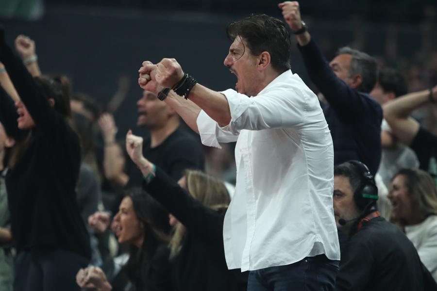 Με το πάθος να ξεχειλίζει ο Δημήτρης Γιαννακόπουλος πανηγύρισε με την καρδιά του στα court seats την ανατροπή του Παναθηναϊκού AKTOR επί του Ερυθρού Αστέρα (82-74).