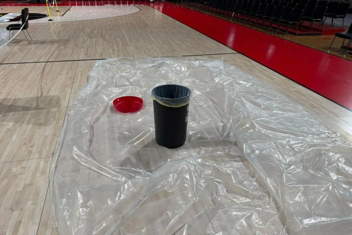 Η βροχή δημιούργησε για μια ακόμη φορά φθορές στο ΣΕΦ, με μπαλώματα προσπαθούν να σώσουν το παρκέ οι άνθρωποι του Ολυμπιακού. – Δεν έχει παραδοθεί ακόμη το γήπεδο στην ερυθρόλευκη ΚΑΕ.