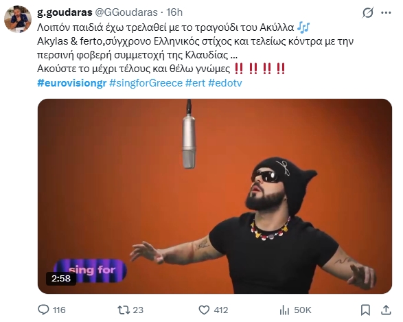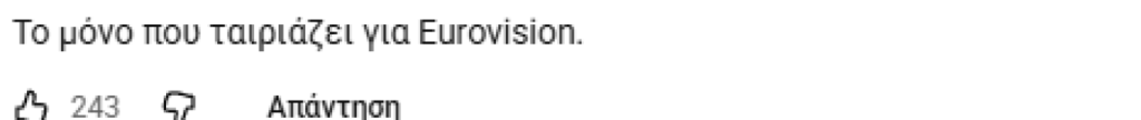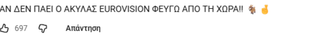 Πιο αναλυτικά, τα σχόλια του κοινού για την ώρα είναι ενθουσιώδη, με πολλούς να μιλούν για «διαμαντάκι» και «κομματάρα», εκφράζοντας τη βεβαιότητα ότι το τραγούδι μπορεί ακόμη και να κερδίσει τη Eurovision. Μερικοί ζητούν από την Ελλάδα να τον στείλει στον διαγωνισμό, τονίζοντας ότι «μόνο αυτό ταιριάζει για Eurovision» και πως «αν δεν πάει ο Akylas, αποτύχαμε». Δεν έλειψαν και οι υπερβολικά ενθουσιώδεις αντιδράσεις, όπως ότι «η Eurovision χρειάζεται εκείνον» και ότι «αν γεμίζει έναν χώρο μόνο με ένα μικρόφωνο, φανταστείτε τι θα κάνει στη σκηνή της Βιέννης», αποτυπώνοντας το έντονο κλίμα στήριξης και προσμονής γύρω από τη συμμετοχή του.