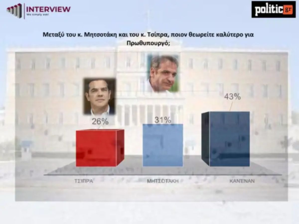 Στην εκτίμηση εκλογικού αποτελέσματος, η διαφορά ΝΔ – ΠΑΣΟΚ περιορίζεται στο 11,1% (25,9% έναντι 14,8%), ενώ τα ποσοστά των υπόλοιπων κομμάτων παραμένουν σταθερά χωρίς σαφή δυναμική. Ιδιαίτερο ενδιαφέρον παρουσιάζει το ερώτημα για τον καταλληλότερο πρωθυπουργό: ο Κυριάκος Μητσοτάκης συγκεντρώνει 31%, ο Αλέξης Τσίπρας ακολουθεί με 26%, αλλά η υψηλότερη απάντηση είναι «κανένας», που φτάνει το 43%, δείχνοντας ότι μεγάλο μέρος των πολιτών αμφισβητεί και τους δύο ηγέτες.