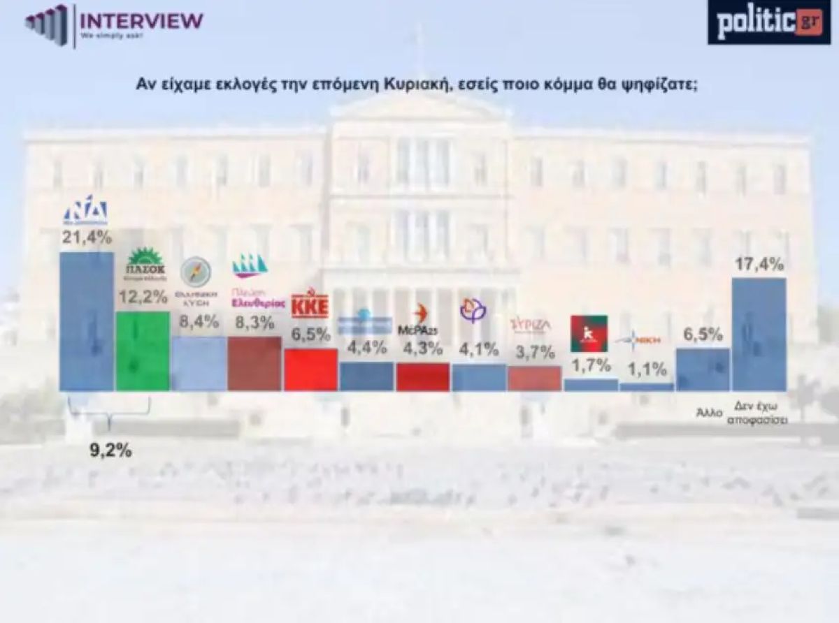Η πρόσφατη έρευνα της εταιρείας Interview για το politic.gr φέρνει… σημαντικές ανατροπές στο πολιτικό τοπίο, με τη Νέα Δημοκρατία να καταγράφει πτώση περίπου πέντε μονάδων σε σχέση με την προηγούμενη μέτρηση, φτάνοντας στο 21,4% στην πρόθεση ψήφου. Παράλληλα, κανένα άλλο κόμμα δεν εμφανίζει ιδιαίτερη άνοδο, ενώ το ΠΑΣΟΚ βρίσκεται στο 12,2% και η Ελληνική Λύση στο 8,4%.