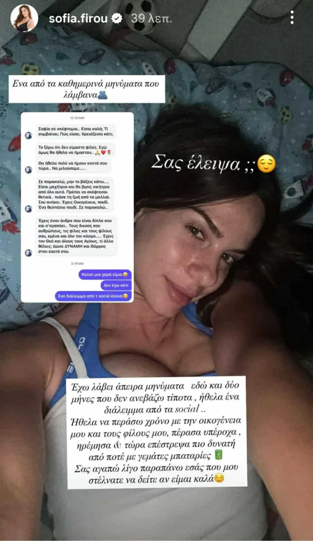 «Έχω λάβει άπειρα μηνύματα εδώ και δύο μήνες που δεν ανεβάζω τίποτα. Ήθελα ένα διάλειμμα από τα social. Ήθελα να περάσω χρόνο με την οικογένειά μου και τους φίλους μου, πέρασα υπέροχα, ηρέμησα και τώρα επέστρεψα πιο δυνατή από ποτέ με γεμάτες μπαταρίες. Σας αγαπώ λίγο παραπάνω εσάς που μου στέλνατε να δείτε αν είμαι καλά», έγραψε στην ανάρτησή της η Σοφία Φυρού.
