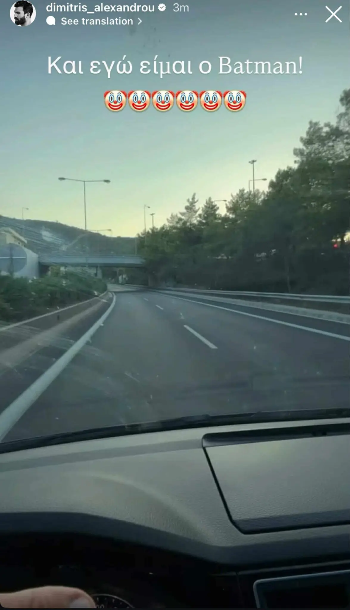 Λίγες ώρες μετά τα όσα είπε η Ιωάννα Τούνη, ο Δημήτρης Αλεξάνδρου έκανε μια όλο νόημα ανάρτηση στον προσωπικό του λογαριασμό στο Instagram. Συγκεκριμένα, ο παρουσιαστής ανέβασε μια φωτογραφία μέσα από το αυτοκίνητό του και έγραψε: «Κι εγώ είμαι ο Batman», συνοδεύοντάς τη με emojis με κλόουν.