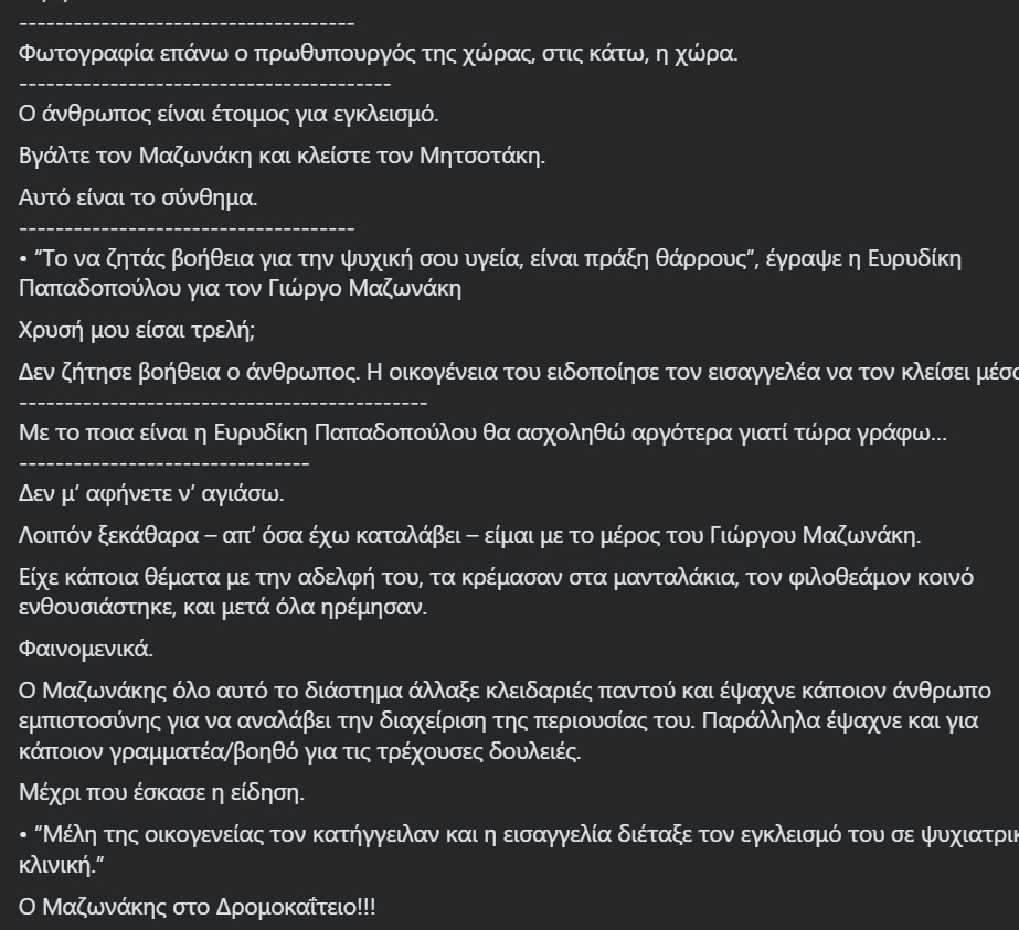 Δεν έμεινε όμως εκεί, καθώς απάντησε και στην ανάρτηση της Ευρυδίκης Παπαδοπούλου που σχολίασε την υπόθεση: «“Το να ζητάς βοήθεια για την ψυχική σου υγεία, είναι πράξη θάρρους”, έγραψε η Ευρυδίκη Παπαδοπούλου για τον Γιώργο Μαζωνάκη. Χρυσή μου είσαι τρελή; Δεν ζήτησε βοήθεια ο άνθρωπος. Η οικογένειά του ειδοποίησε τον εισαγγελέα να τον κλείσει μέσα. Με το ποια είναι η Ευρυδίκη Παπαδοπούλου θα ασχοληθώ αργότερα γιατί τώρα γράφω…».