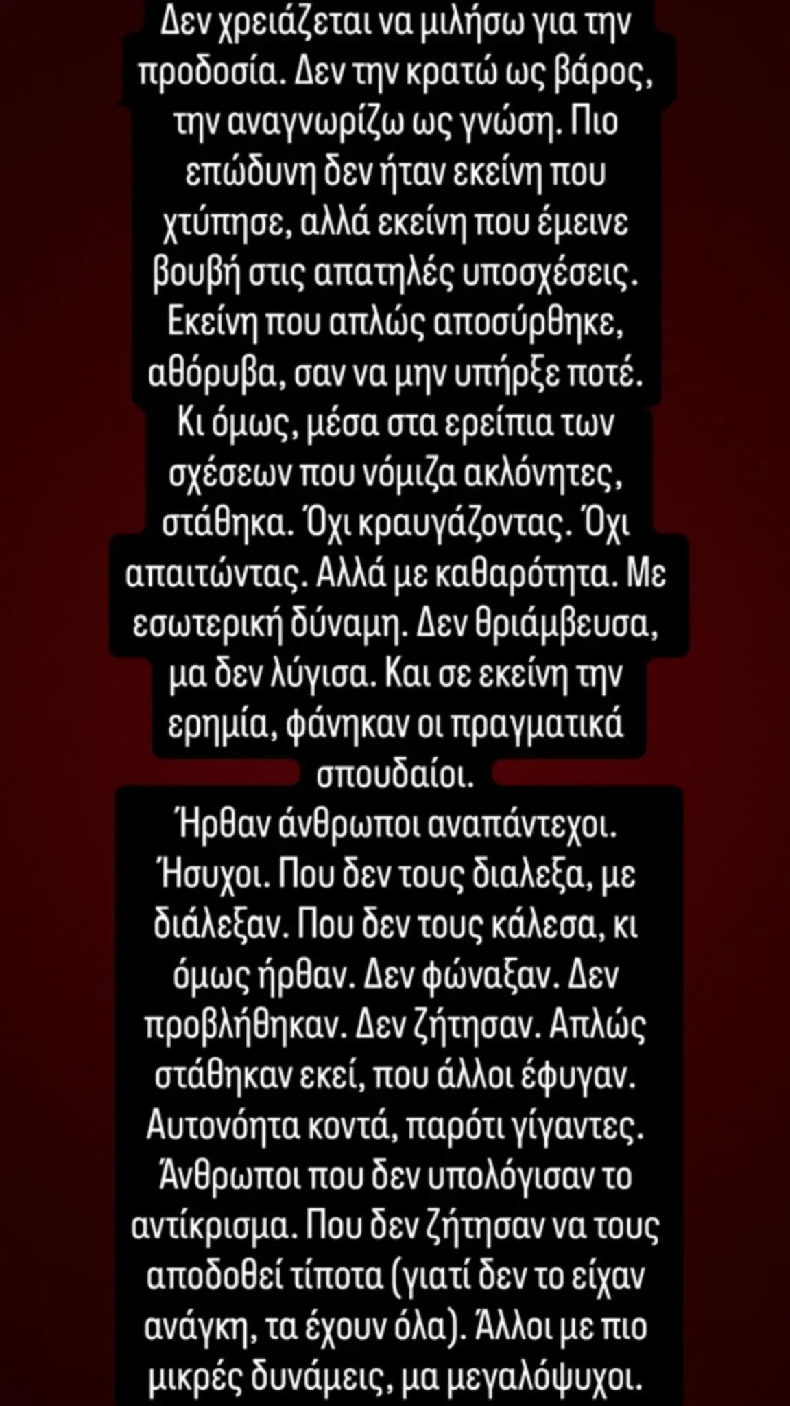Δεν χρειάζεται να μιλήσω για την προδοσία. Δεν την κρατώ ως βάρος, την αναγνωρίζω ως γνώση. Πιο επώδυνη δεν ήταν εκείνη που χτύπησε, αλλά εκείνη που έμεινε βουβή στις απατηλές υποσχέσεις. Εκείνη που απλώς αποσύρθηκε, αθόρυβα, σαν να μην υπήρξε ποτέ. Κι όμως, μέσα στα ερείπια των σχέσεων που νόμιζα ακλόνητες, στάθηκα. Όχι κραυγάζοντας. Όχι απαιτώντας. Αλλά με καθαρότητα. Με εσωτερική δύναμη. Δεν θριάμβευσα, μα δεν λύγισα. Και σε εκείνη την ερημία, φάνηκαν οι πραγματικά σπουδαίοι.