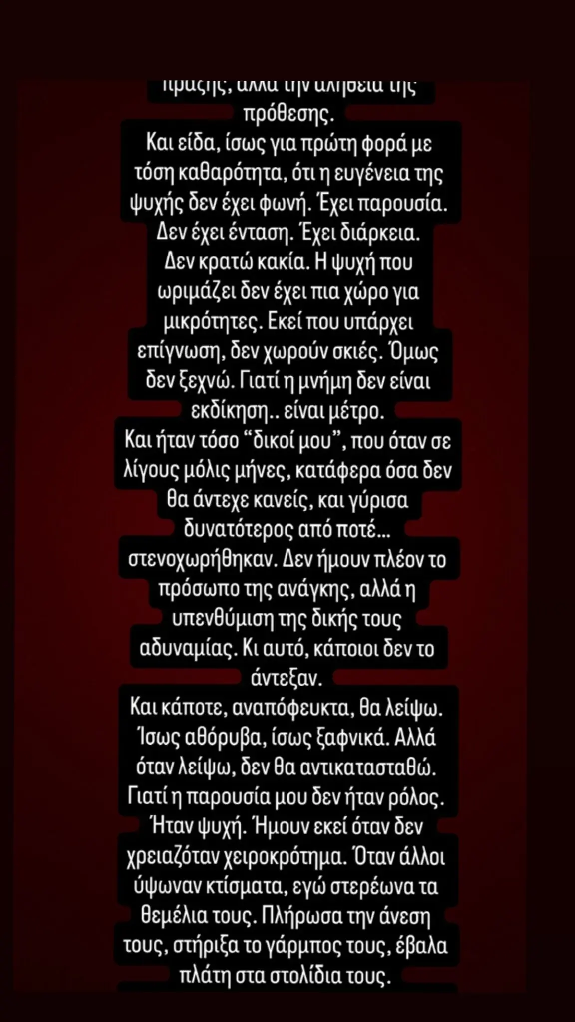 Δεν ήμουν πλέον το πρόσωπο της ανάγκης, αλλά η υπενθύμιση της δικής τους αδυναμίας. Κι αυτό, κάποιοι δεν το άντεξαν. Και κάποτε, αναπόφευκτα, θα λείψω. Ίσως αθόρυβα, ίσως ξαφνικά. Αλλά όταν λείψω, δεν θα αντικατασταθώ. Γιατί η παρουσία μου δεν ήταν ρόλος. Ήταν ψυχή. Ήμουν εκεί όταν δεν χρειαζόταν χειροκρότημα. Όταν άλλοι ύψωναν κτίσματα, εγώ στερέωνα τα θεμέλια τους. Πλήρωσα την άνεση τους, στήριξα το γάρμπος τους, έβαλα πλάτη στα στολίδια τους.