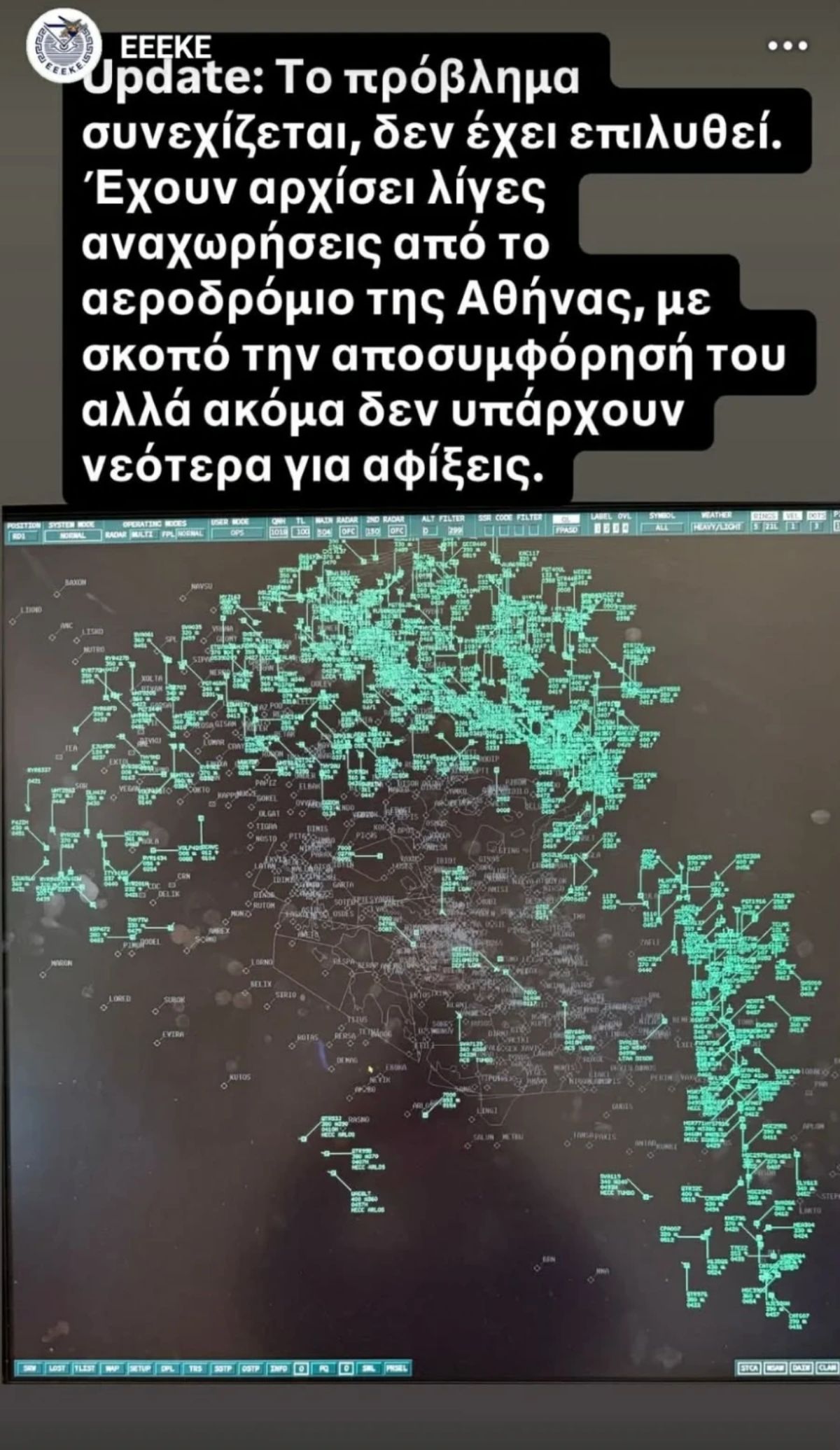 Σύμφωνα με ανακοίνωση της Ένωσης Ελεγκτών Εναέριας Κυκλοφορίας Ελλάδος στα social media, η δυσλειτουργία συνεχίζει να καθηλώνει πτήσεις και να ταλαιπωρεί χιλιάδες επιβάτες. Μερικές αναχωρήσεις από την Αθήνα έχουν ξεκινήσει με στόχο την αποσυμφόρηση του αεροδρομίου, ενώ δεν υπάρχουν νεότερα σχετικά με τις αφίξεις.
