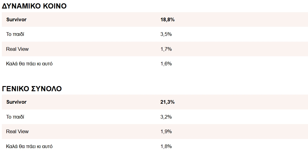 Χθες, Τρίτη 13 Ιανουαρίου, το Survivor σημείωσε μέσο όρο 18,8% στο δυναμικό κοινό και 21,3% στο γενικό σύνολο.