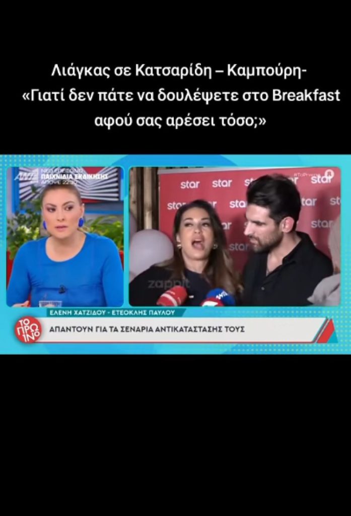 Το τηλεοπτικό παρασκήνιο πήρε φωτιά για ακόμα μια φορά, με τον αέρα του ΑΝΤ1 να γίνεται πεδίο μάχης ανάμεσα στον κεντρικό παρουσιαστή και τους συνεργάτες του. Σε ένα βίντεο που δημοσιεύτηκε από τον λογαριασμό @allgoodgr στο TikTok, οι χρήστες παρακολουθούν παγωμένοι την αμήχανη στιγμή που ο Γιώργος Λιάγκας «επιτίθεται» φραστικά στον Πάνο Κατσαρίδη και τη Δέσποινα Καμπούρη, με αφορμή τα καλά τους λόγια για την ανταγωνιστική εκπομπή του Star. Η ένταση ήταν διάχυτη στο πλατό, καθώς μια απλή παρατήρηση για την ποιότητα του Breakfast@star στάθηκε η αφορμή για ένα «πέσιμο» που σχολιάστηκε ποικιλοτρόπως στα social media.