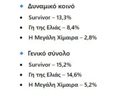 Ακόμη πιο ισχυρή ήταν η εικόνα στο γενικό σύνολο, όπου το Survivor άγγιξε 15,2%, δείχνοντας τη δυναμική του σε όλο το τηλεοπτικό φάσμα. Η Γη της Ελιάς βρέθηκε κοντά, με 14,6%, ενώ η Μεγάλη Χίμαιρα κατέγραψε 5,2%.
