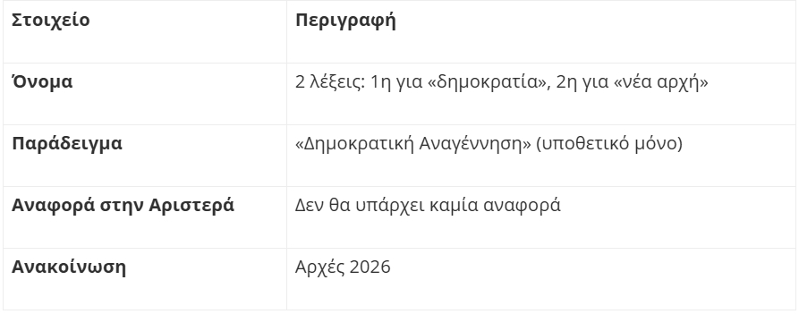 Η δεύτερη λέξη θα επικεντρώνεται στο ξεκίνημα, τη νέα αρχή ή την αλλαγή — όπως π.χ. «αναγέννηση». Δεν θα περιέχει καμία αναφορά στην «Αριστερά»