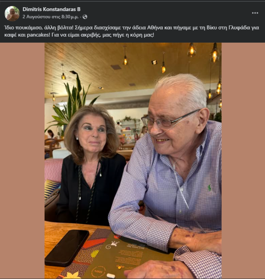 Στην τελευταία του ανάρτηση, στις 2 Αυγούστου εμφανιζόταν χαμογελαστός μαζί με την σύζυγό του, Βίκυ σε μια βόλτα τους στην Γλυφάδα.