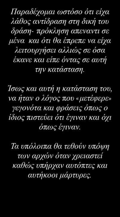 Παραδέχομαι ωστόσο ότι είχα λάθος αντίδραση στη δική του δράση-πρόκληση απέναντι σε μένα, και ότι θα έπρεπε να είχα λειτουργήσει αλλιώς σε όσα έκανε και είπε όντας σε αυτή την κατάσταση.