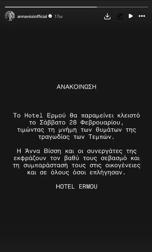 Στην ανακοίνωση αναγράφεται χαρακτηριστικά: «Το Hotel Ερμού θα παραμείνει κλειστό το Σάββατο 28 Φεβρουαρίου, τιμώντας τη μνήμη των θυμάτων της τραγωδίας των Τεμπών. Η Άννα Βίσση και οι συνεργάτες της εκφράζουν τον βαθύ τους σεβασμό και τη συμπαράστασή τους στις οικογένειες και σε όλους όσους επλήγησαν. HOTEL ERMOU».