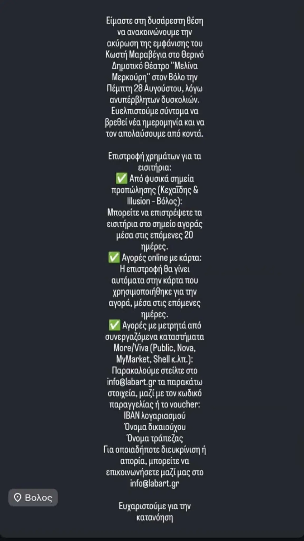 Ακυρώθηκε η προγραμματισμένη εμφάνιση του Κωστή Μαραβέγια στο θερινό Δημοτικό Θέατρο «Μελίνα Μερκούρη» στον Βόλο, η οποία είχε ανακοινωθεί για την Πέμπτη 28 Αυγούστου.