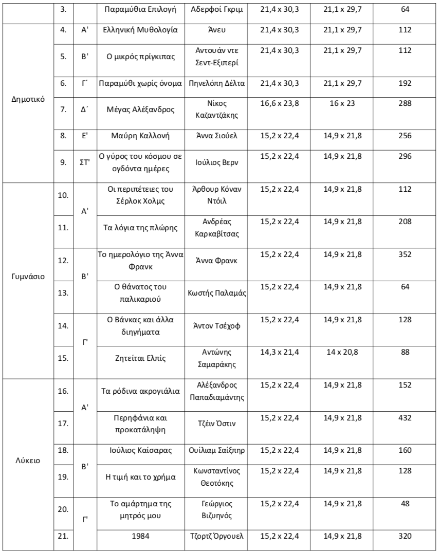 Το υπουργείο Παιδείας θα στείλε στα Λύκεια, Γυμνάσια, Δημοτικά και Νηπιαγωγεία τα ακόλουθα λογοτεχνικά βιβλία στο πλαίσιο του μαθήματος της Γλώσσας και της Λογοτεχνίας για τους/τις μαθητές/τριες της Πρωτοβάθμιας και Δευτεροβάθμιας Εκπαίδευσης: