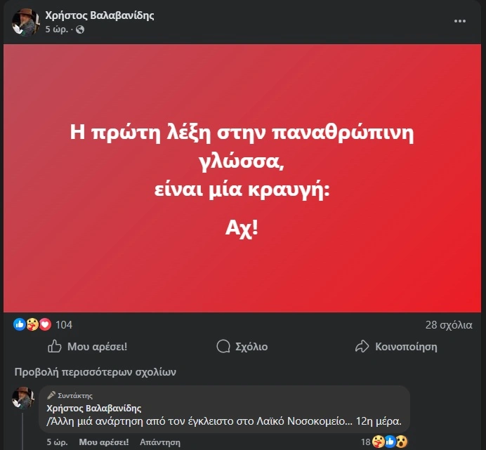 Πριν από περίπου πέντε ώρες, ο ηθοποιός προχώρησε σε νέα ανάρτηση, δημοσιεύοντας ένα λιτό μήνυμα με τη φράση: «Η πρώτη λέξη στην πανανθρώπινη γλώσσα, είναι μια κραυγή: Αχ!», συνοδεύοντάς τη με σχόλιο στο οποίο αναφέρει ότι πρόκειται για ανάρτηση «από τον εγκλεισμό στο Λαϊκό Νοσοκομείο… 12η μέρα».