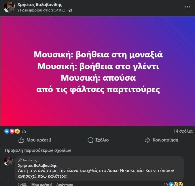 Στην ανάρτηση που έκανε πριν από δύο μέρες, ο Χρήστος Βαλαβανίδης είχε παραθέσει έναν σύντομο διάλογο με φιλοσοφικό χαρακτήρα, χωρίς ωστόσο να δώσει περισσότερες πληροφορίες για το πρόβλημα υγείας που αντιμετωπίζει.