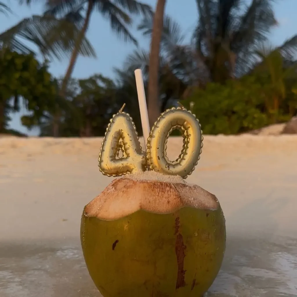 Η Ιωάννα Παλιοσπύρου φαίνεται να γιορτάζει ανέμελη την είσοδό της στην τέταρτη δεκαετία της ζωής της, φορώντας ένα κόκκινο ολόσωμο μαγιό, το οποίο έχει συνδυάσει με μία πλεκτή μπαντάνα, ενώ χαλαρώνει στην άμμο της μαγευτικές παραλίας στις Μαλδίβες, γιορτάζοντας με μία καρύδα αντί για τούρτα!