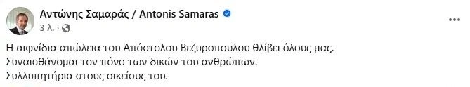 «Συναισθάνομαι τον πόνο των δικών του ανθρώπων», σημειώνει στο συλλυπητήριό μήνυμά του μέσω του Facebook ο Αντώνης Σαμαράς για τον χαμό του Απόστολου Βεσυρόπουλου.