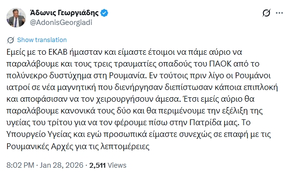 Στην ανάρτησή του, ο κ. Γεωργιάδης τόνισε ότι το Υπουργείο Υγείας παραμένει σε συνεχή επικοινωνία με τις Ρουμανικές Αρχές για την κατάσταση της υγείας των τραυματιών και τις λεπτομέρειες της επιστροφής τους.