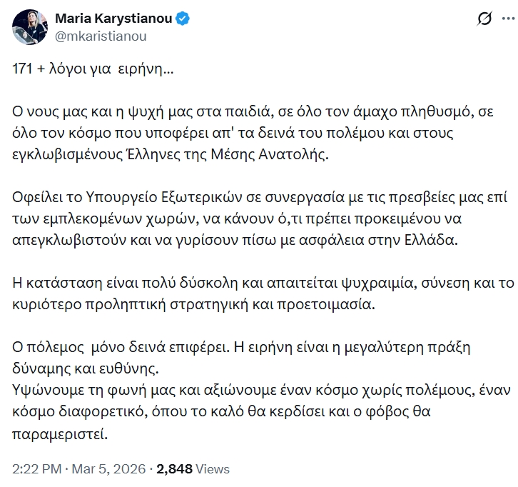 Η Μαρία Καρυστιανού ξεκινά την νέα παρέμβασή της με τη φράση «171 + λόγοι για ειρήνη…», σημειώνοντας ότι «ο νους μας και η ψυχή μας» βρίσκεται «στα παιδιά, σε όλο τον άμαχο πληθυσμό, σε όλο τον κόσμο που υποφέρει απ’ τα δεινά του πολέμου» και στους Έλληνες που παραμένουν εγκλωβισμένοι στη Μέση Ανατολή.