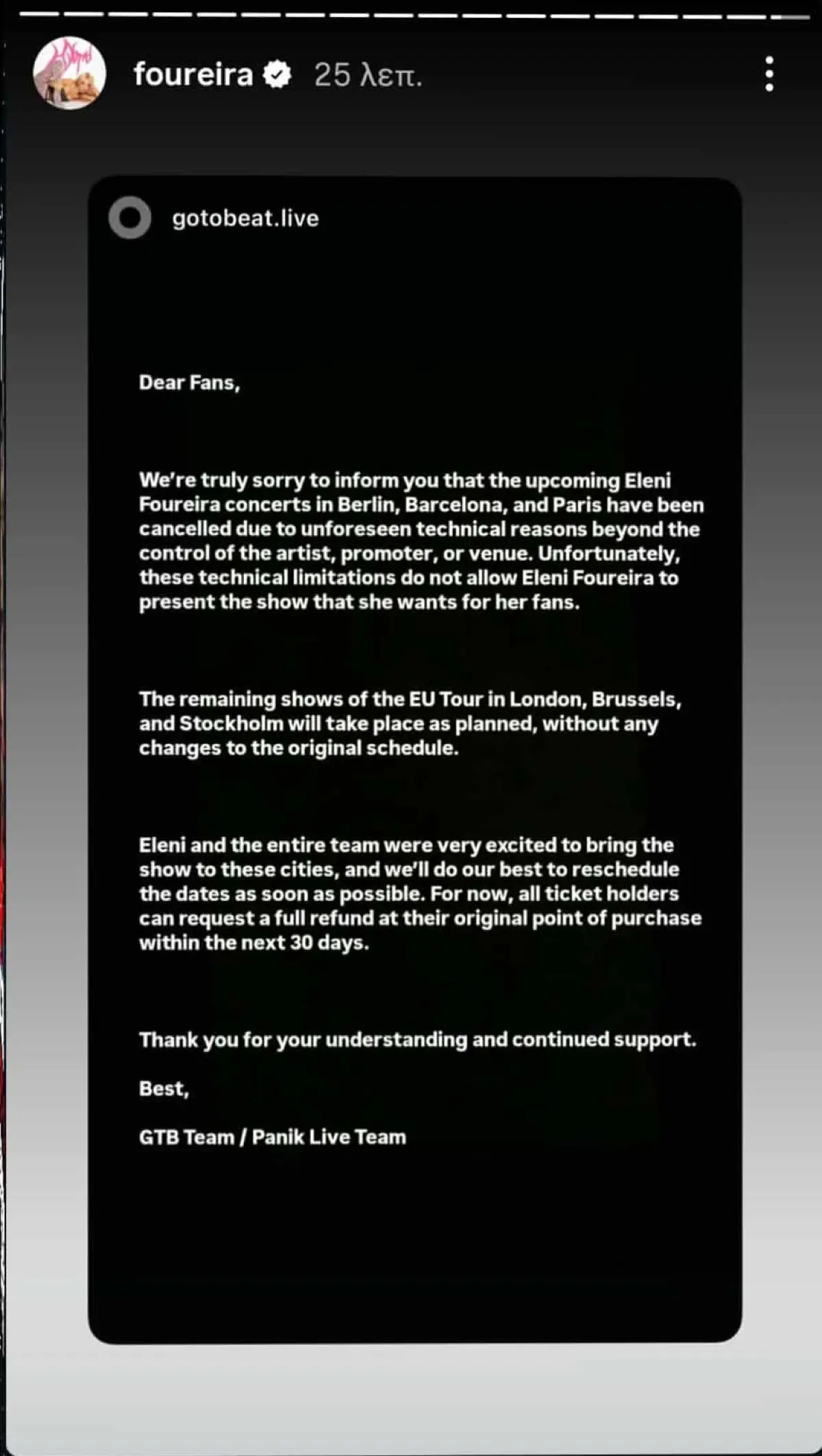 Στην επίσημη ανακοίνωση αναφέρεται: «Αγαπητοί fans, σας ενημερώνουμε μετά λύπης ότι οι επερχόμενες συναυλίες της Ελένης Φουρέιρα σε Βερολίνο, Βαρκελώνη και Παρίσι ακυρώνονται λόγω απρόβλεπτων τεχνικών λόγων, πέρα από τον έλεγχο της καλλιτέχνιδας, του διοργανωτή ή του χώρου. Δυστυχώς, αυτοί οι τεχνικοί περιορισμοί δεν επιτρέπουν στην Ελένη Φουρέιρα να παρουσιάσει το show όπως εκείνη το οραματίζεται για τους fans της. Οι υπόλοιπες εμφανίσεις της ευρωπαϊκής περιοδείας, σε Λονδίνο, Βρυξέλλες και Στοκχόλμη, θα πραγματοποιηθούν κανονικά, χωρίς καμία αλλαγή στο αρχικό πρόγραμμα.