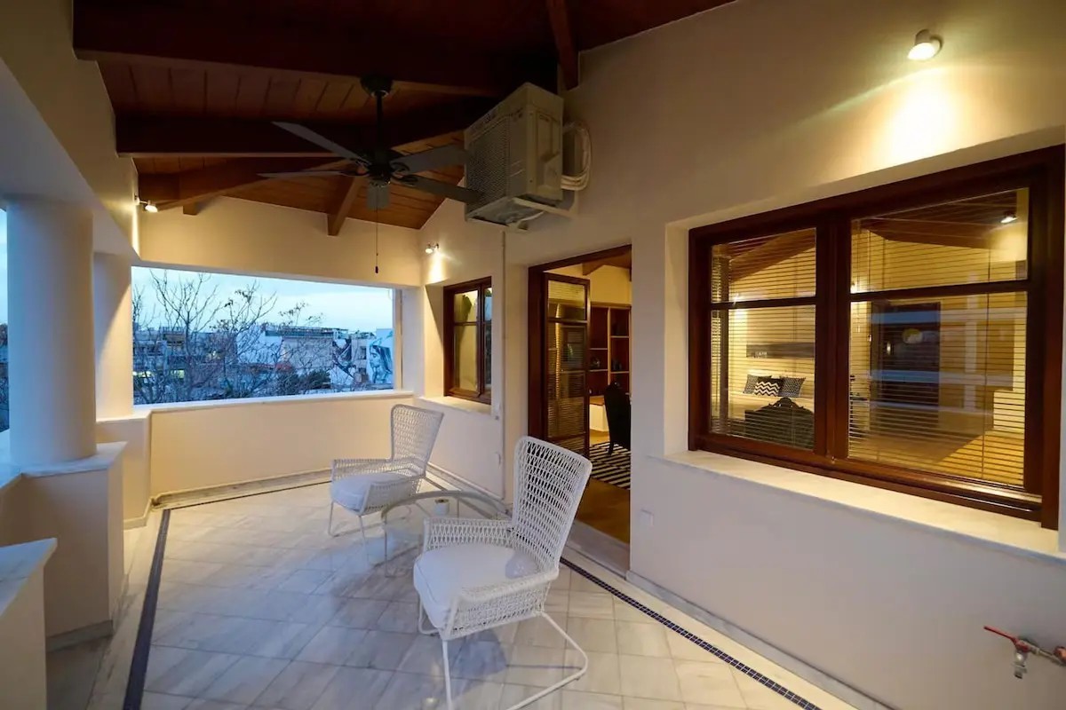 Η σοφίτα με ξύλινη οροφή, τα εμφανή δοκάρια και ένα τζάκι, έδινε την αίσθηση σουίτας σε εξοχικό καταφύγιο — ενώ τα μεγάλα παράθυρα και οι βεράντες της δίνουν απεριόριστη θέα στην Ακρόπολη και στον Λυκαβηττό. Το interior design είχε αναλάβει ομάδα επαγγελματιών (με την επιμέλεια διακόσμησης από εταιρεία design του χώρου), συνδυάζοντας με επιτυχία το μοντέρνο με το κλασικό.