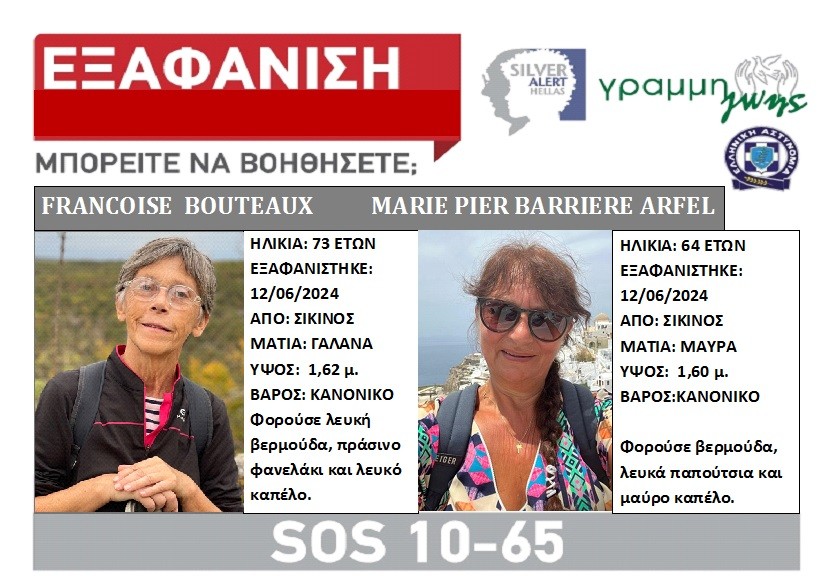 Η Φρανσουάζ Μπουτό 73 χρόνων και η Μαρί Πιέρ Αρφέλ, 64 χρονών αγνοούνται από το πρωί της Παρασκευής 14 Ιουνίου. Οι δύο γυναίκες που φαίνεται ότι γνωρίστηκαν μετά την άφιξη τους στο νησί, έδωσαν ραντεβού έξω από το κατάλυμα που διέμενε η Μαρί, για να ακολουθήσουν μαζί μια από τις πεζοπορικές διαδρομές του νησιού. Φαίνεται όμως πως για άγνωστο λόγο βρέθηκαν εκτός πορείας και τα ίχνη τους χάθηκαν.