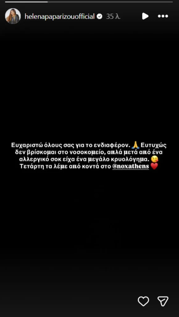 «Ευχαριστώ όλους σας για το ενδιαφέρον. Ευτυχώς δεν βρίσκομαι στο νοσοκομείο. Απλά μετά από ένα αλλεργικό σοκ είχα ένα μεγάλο κρυολόγημα. Τετάρτη τα λέμε από κοντά στο Nox» γράφει χαρακτηριστικά η Έλενα Παπαρίζου στην ανάρτησή της στα social media, καθησυχάζοντας τους fans της.