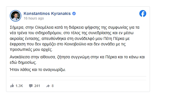 Δημόσια συγγνώμη από τη βουλεύτρια της Νέας Αριστεράς, Πέτη Πέρκα, ζήτησε ο αναπληρωτής υπουργός Μεταφορών, Κωνσταντίνος Κυρανάκης, μέσω ανάρτησής του στα κοινωνικά δίκτυα, αναγνωρίζοντας τη σεξιστική επίθεση που εξαπέλυσε σε βάρος της.