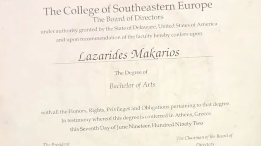 «Κολέγιο της Νοτιοδυτικής Ευρώπης – Διοικητικό Συμβούλιο: Με την εξουσία που επιδίδεται από την Πολιτεία του Ντέλαγουεαρ, των Ηνωμένων Πολιτειών Αμερικής, και κατόπιν συστάσεων του προσωπικού, με το κατωτέρω απονέμουμε στον Λαζαρίδη Μακάριο το Δίπλωμα Bachelor στις Τέχνες».